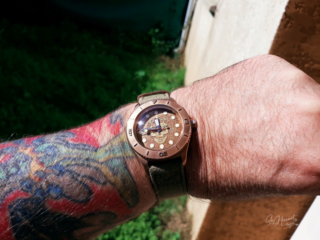 - Pour le mouvement est un NH 35 avec le choix d'un disque des chiffres dates blancs. Les aiguilles ne sont pas celles prévues, je suis partie pour celles de marine master que j'étais sûr d'avoir en stock et non, nada :louloup2:. Voilà le résultat final plutôt est réussi, à mon goût, restera à changer les aiguilles dès la réception des nouvelles. Je termine avec l'habituelle photo " au poignet " Image