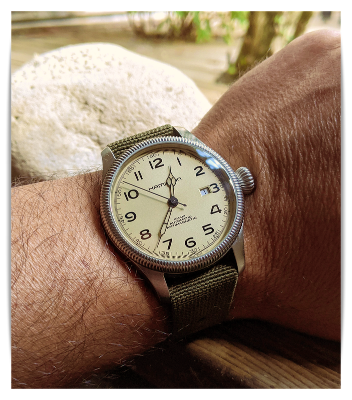 Son cadran blanc ivoire est superbe car il prends des teintes irisées bleu/rose selon l'incidence de la lumière.