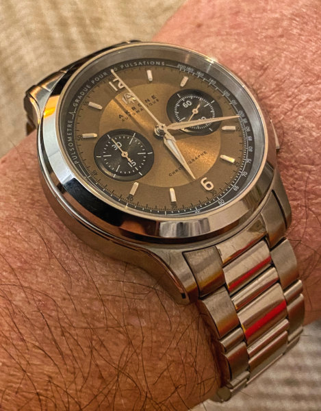 Akrone K05 Pulsomètre, un modèle panda bronze tout récent d'un chrono déjà vu ici, avec un beau soleillage central et des changements d'aspects constants, le centre étant tantôt plus clair tantôt plus foncé que son pourtour selon les angles, toujours avec une excellente lisibilité, des aiguilles élégantes et un beau bracelet acier poli/brossé : une belle réussite.