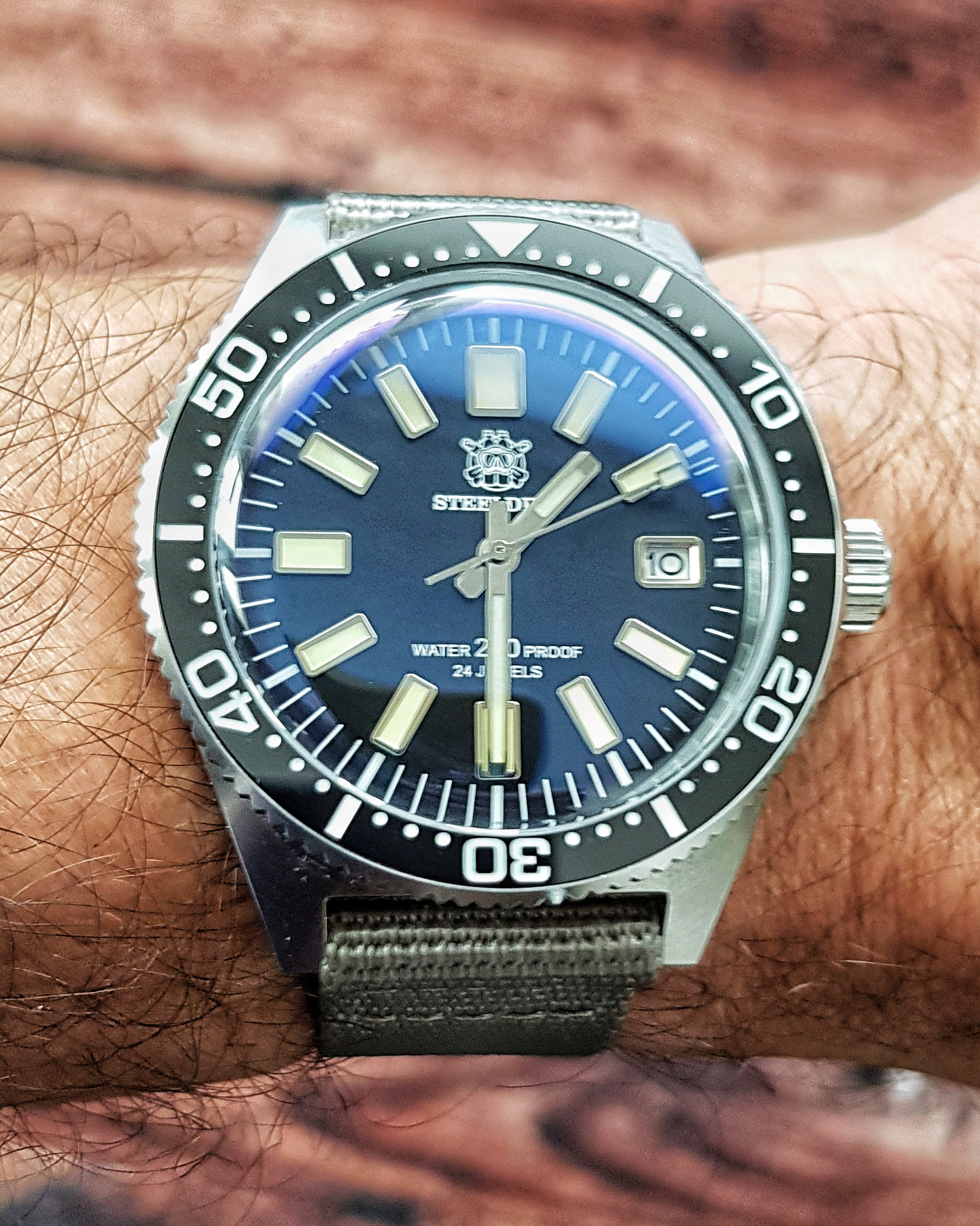 J'avais dans l'idée de le monter sur un Waffle car je trouve l'association très réussie. Néanmoins les plans devraient changer bientôt: dans l'attente d'une SteelDive 62Mas, ce sera cette dernière qui sera finalement portée sur bracelet gauffré et je laisse la 051 sur acier car je suis particulièrement satisfait de ce bracelet.