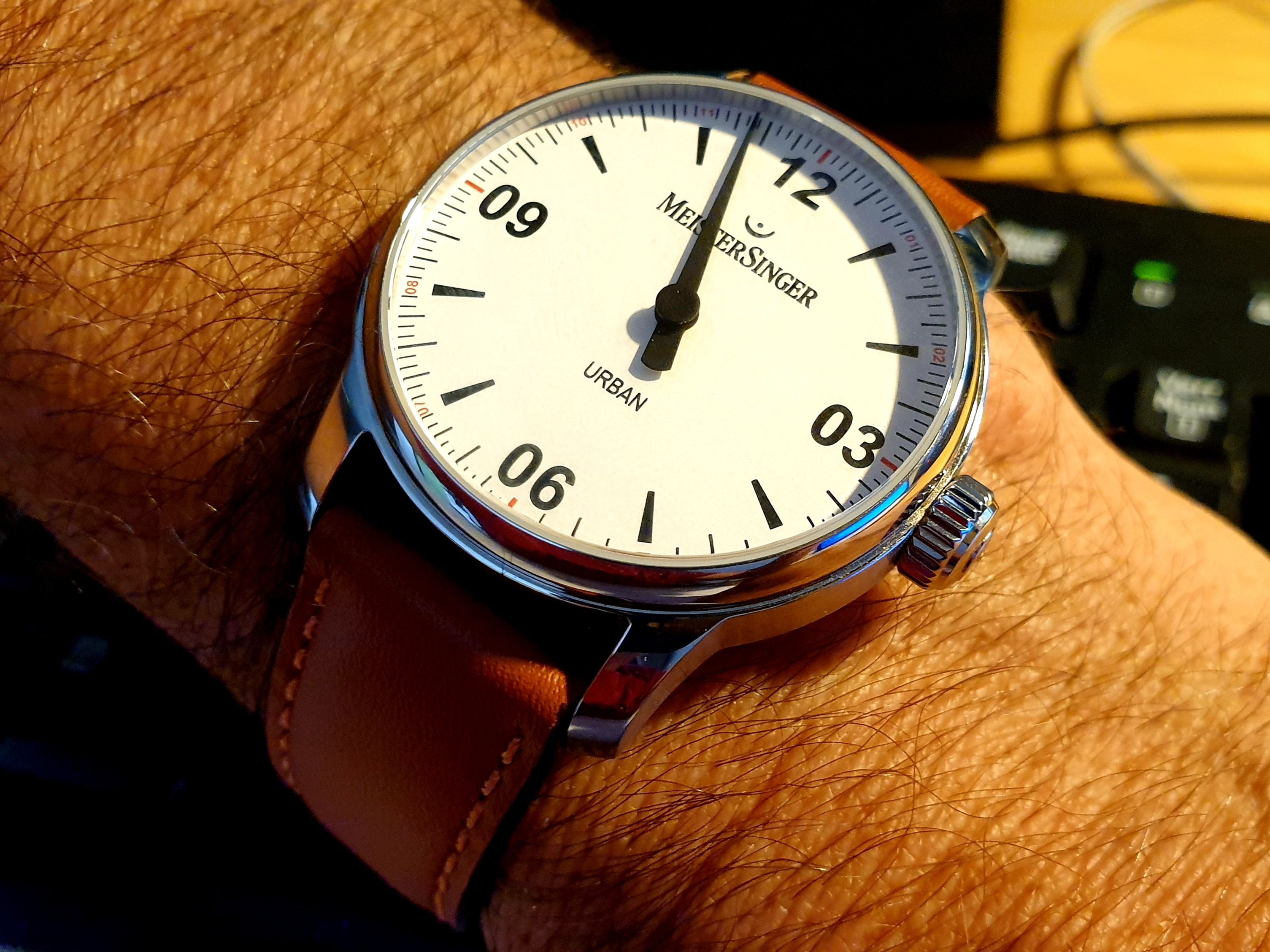 J'avoue qu'entre la U1 et la MM300 qui squattent allégrement mon poignet ces dernier temps, et les EZM3 et Squale que j'ai mise dernièrement, j'ai eu un moment de surprise en mettant la Damasko cette semaine : "ah la couronne à 3h, quelle invention étrange !"