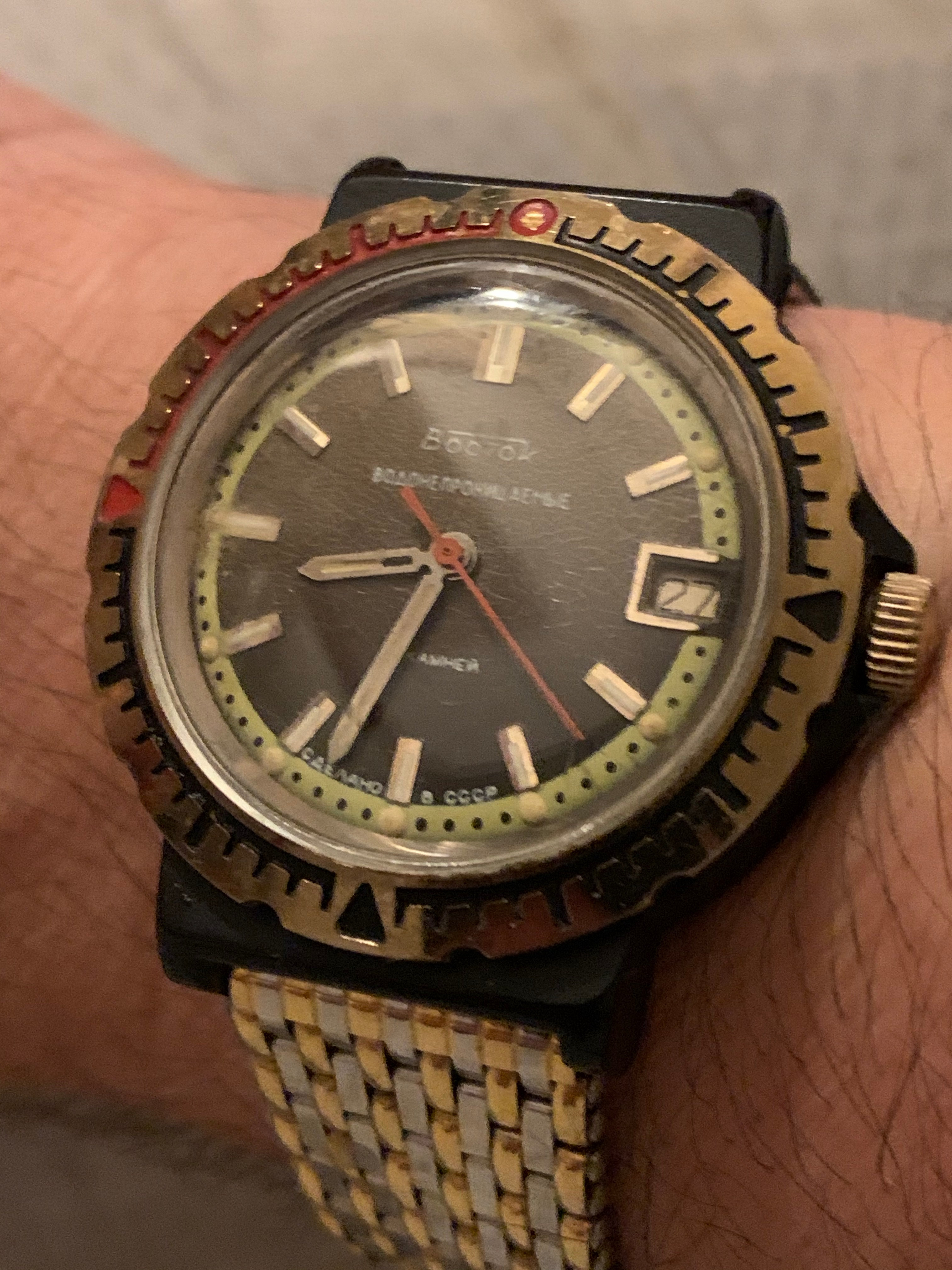Une Vostok avec son boîtier en plastique