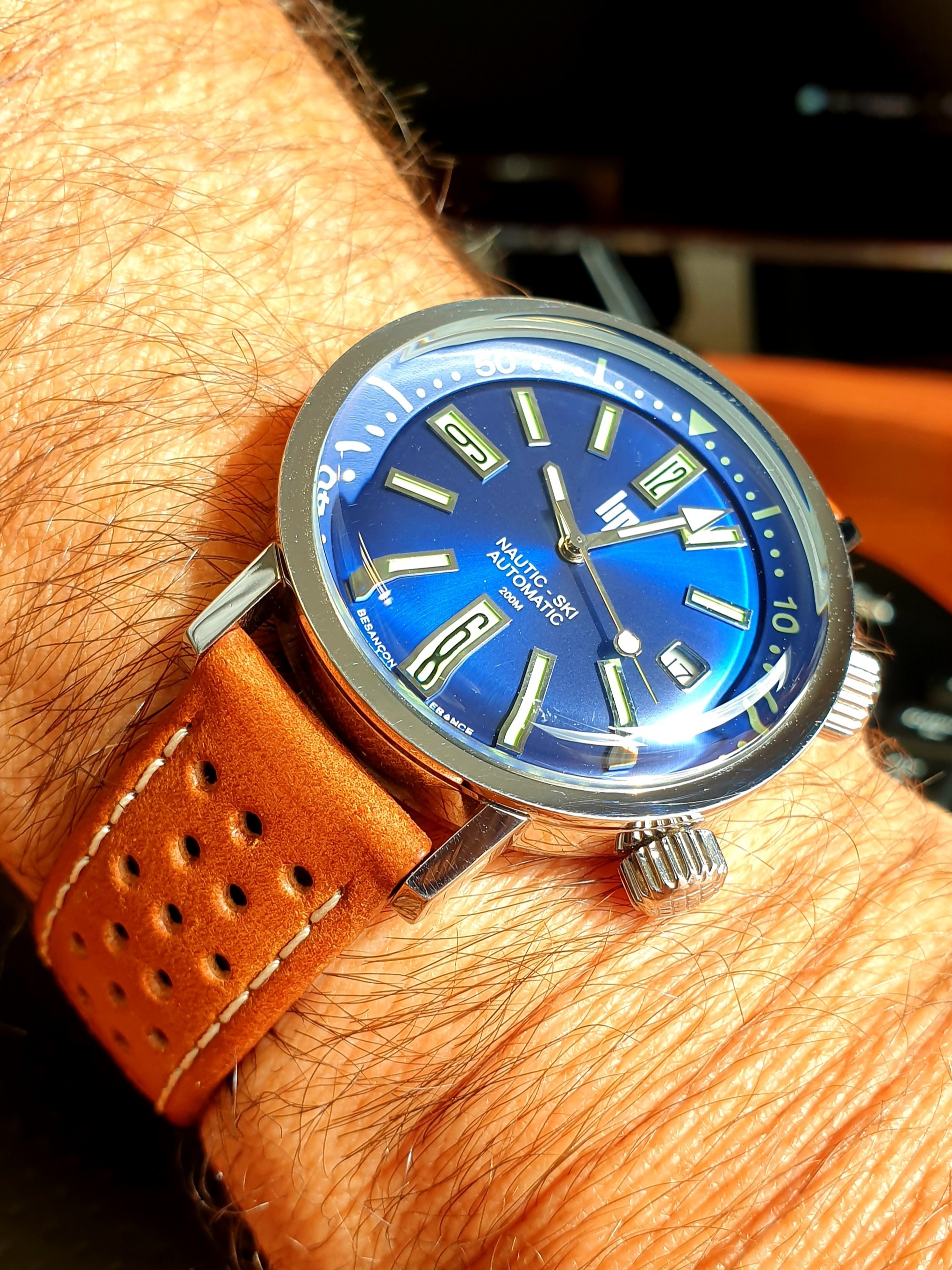 Joli ce cuir, belle combinaison avec ce cadran bleu.