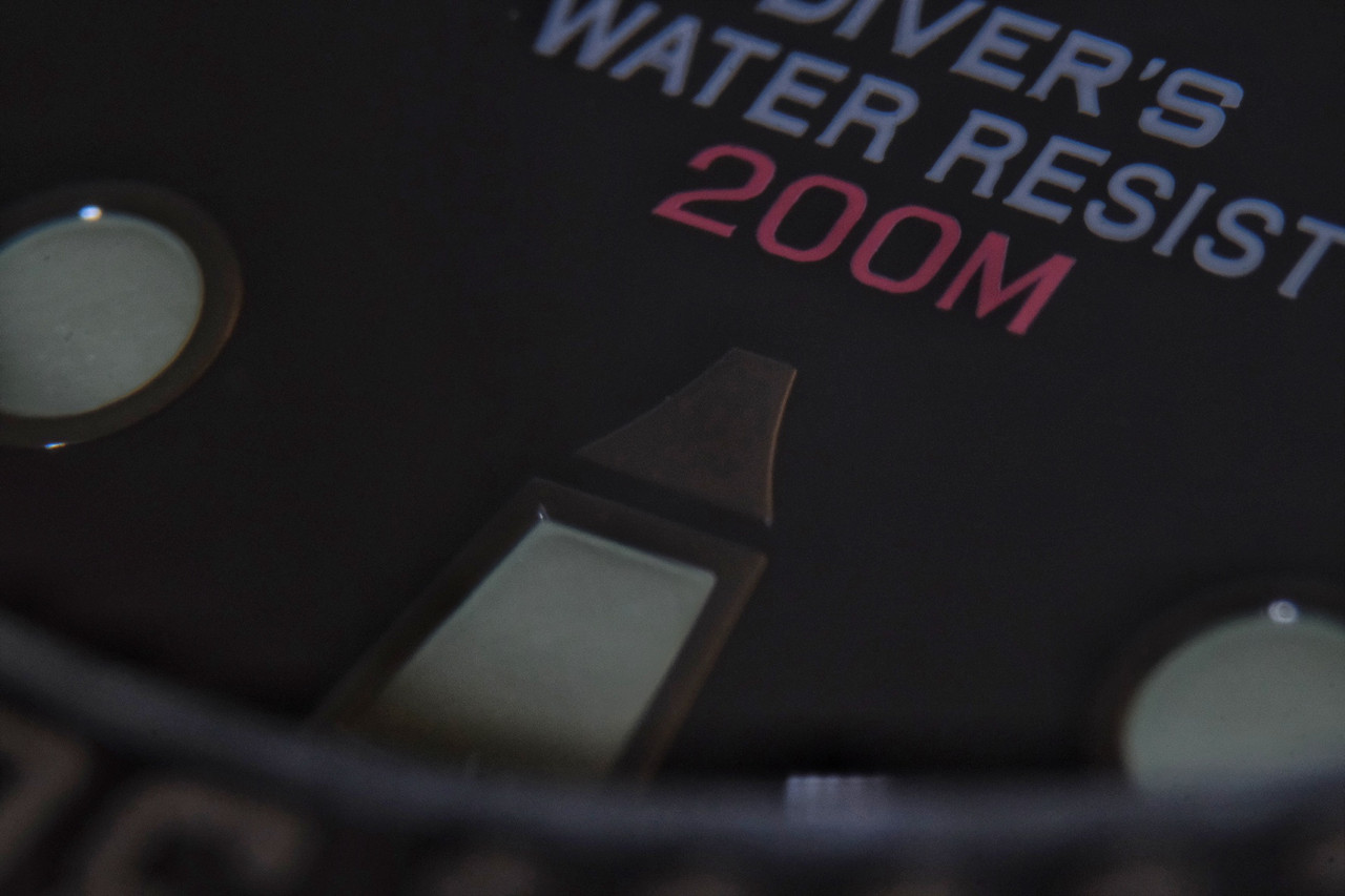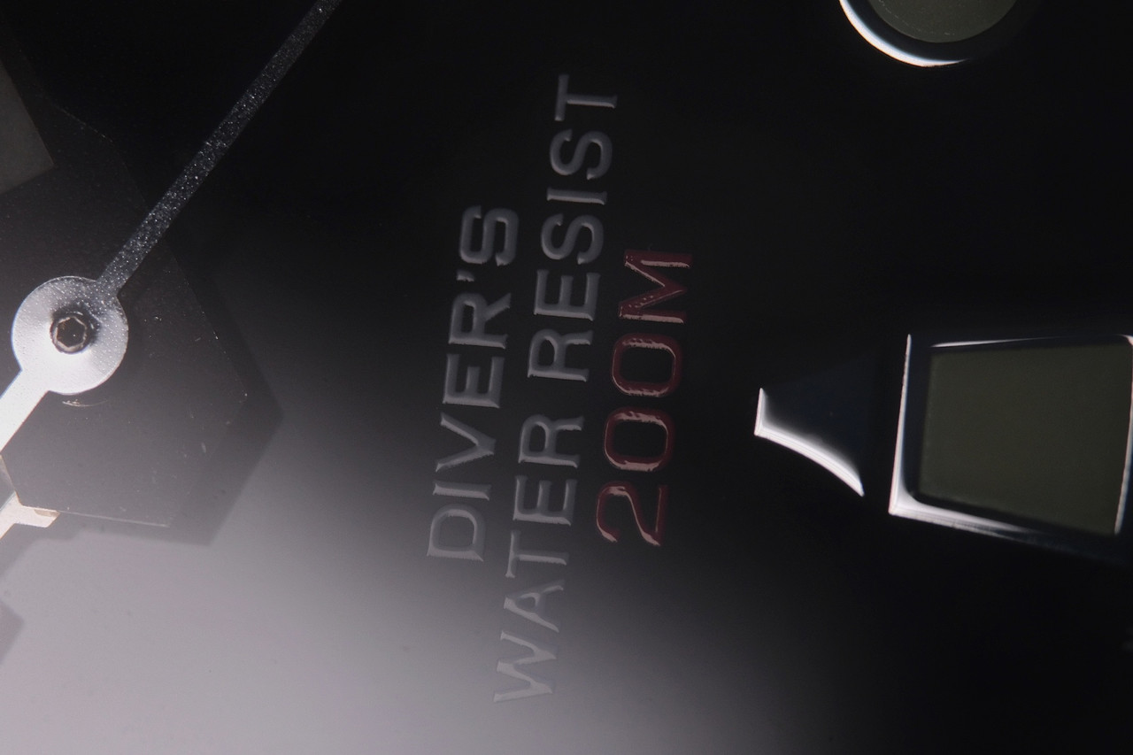 A 6h, DIVER‘S WATER RESIST en blanc suivi de 200M en rouge.